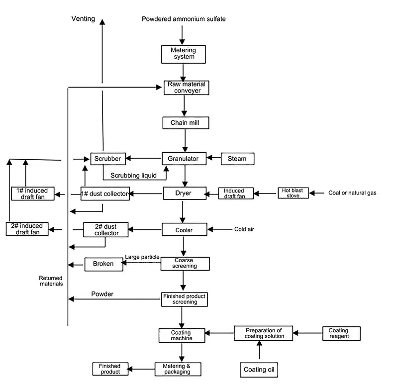 Грануляция достигается за счет подачи пара давлением 0.3-0.8 МПа, что приводит к образованию сферических гранул в грануляторе. Полученный гранулированный материал затем подвергается сушке, охлаждению и просеиванию с последующим нанесением покрытия и упаковки. В результате получается гранулированный сульфат аммония круглой формы.