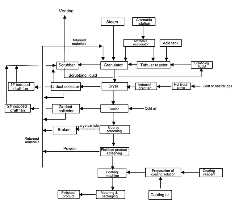 При распылительной грануляции в трубчатом реакторе газообразный аммиак, серная кислота и промывочная жидкость подаются в трубчатый реактор в контролируемых пропорциях. Внутри реактора реагенты образуют высокотемпературную суспензию сульфата аммония, которая распыляется на переработанный сульфат аммония внутри вращающегося барабанного гранулятора.