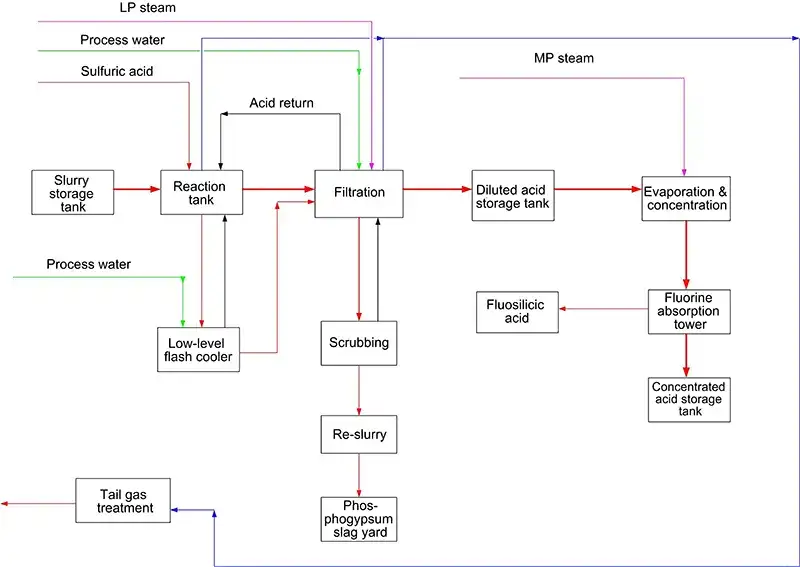 Фосфатная руда в виде суспензии и серная кислота (98% по массе) поступают в реакционную емкость с функцией перемешивания в контролируемом соотношении. Основные параметры, такие как концентрация ионов SO₄²⁻ и соотношение жидкого к твердому (2.5-3.0:1), точно контролируются.