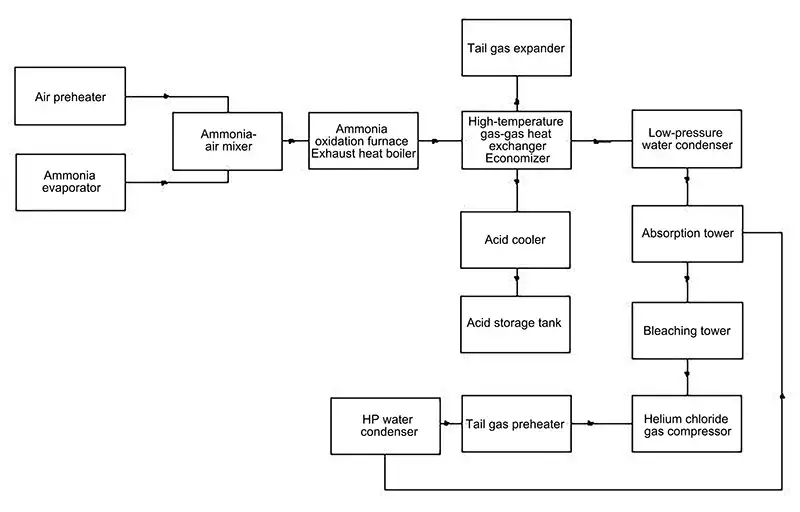 Отработанные газы выходят с верхней части абсорбционной башни и поступают в сепаратор отработанных газов, где удаляется мелкодисперсная жидкость. Газ сначала нагревается примерно до 55℃ в охладителе вторичного воздуха, затем дополнительно нагревается примерно до 155℃ в предварительном нагревателе отработанных газов с использованием газа оксида азота высокого давления. В конечном итоге отработанные газы нагреваются до 360-390℃ в теплообменнике газ-газ и подаются в турбину для расширения отработанных газов, где восстанавливается часть энергии. С помощью данной системы рекуперации энергии можно восстановить более 50% общей мощности компрессии. После каталитической очистки от аммиака концентрация NOₓ в отработанных газах снижается до ≤ 56 ppm (v), и очищенные отработанные газы выводятся через трубопровод отработанных газов.
