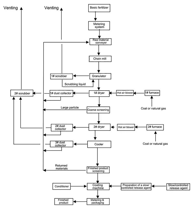 Весовой дозатор, ленточный конвейер, дробилка, ковшовый элеватор, гранулятор, сушилка, охладитель, машина для просеивания, бак приготовления состава медленного высвобождения, машина для нанесения покрытия, упаковочная машина, печь горячего воздуха, вытяжной вентилятор, система очистки отходящих газов.